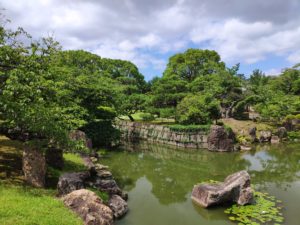 Potom, co jsme se dosyta najedli, vyrazili jsme k našemu prvnímu cíli, hradu Nijo*. Tento hrad se začal stavět roku 1603, jako sídlo tehdejšího Shoguna; dokončen byl však až o 23 let později, za vlády jiného panovníka. Jeho paláce jsou nejlépe dochovanými památkami z japonského feudálního období a díky tomu byl hrad Nijo* v roce 1994 přidán do světového dědictví UNESCA.